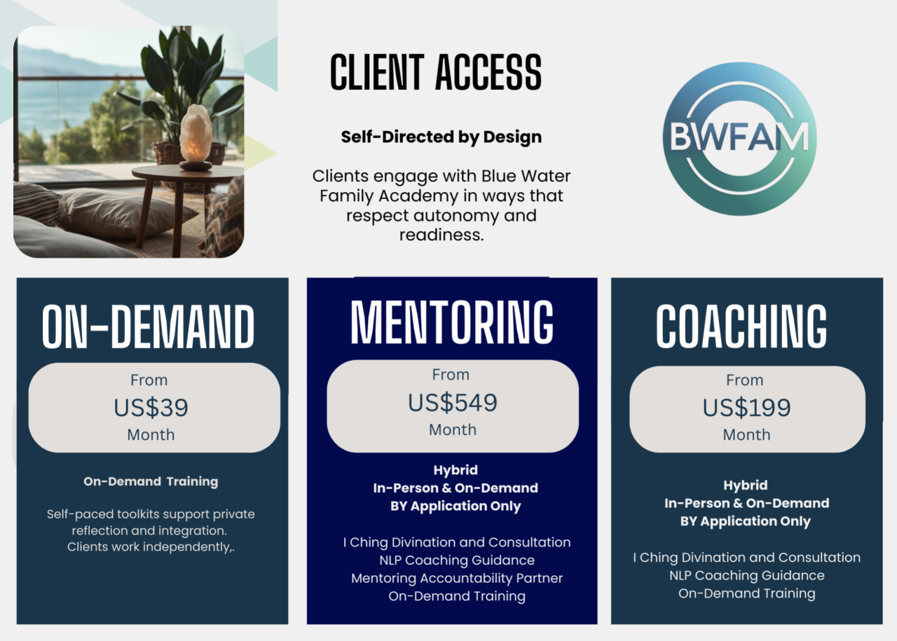 1] identify your readiness for support 2] apply for one to one coaching and a bespoke in-person I Ching reading 3] apply for mentoring with a journey-guide accountability partner 4]Mentoring and Coaching Update, until further notice, from December 2025, the remaining places on the waitlist will be allocated to clients in North America and the UK only, subject to availability, terms and conditions apply. On-Demand Toolkits are accessible internationally, with access to occasional group meetings.